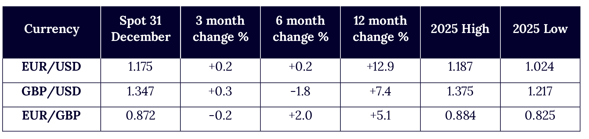 Interest rate differentials have narrowed in recent months as the Bank of England has cut interest rates while the ECB has stayed on hold. Despite this, sterling has recovered since November. If the recent improvement in UK inflation data is sustained, allowing the Bank of England to reduce interest rates more rapidly and this is seen as boosting the UK economy, sterling could strengthen, in spite of narrowing rate differentials. Conversely, an upturn in the European economy with the prospect of a possible ECB rate increase later in 2026 would benefit the euro.