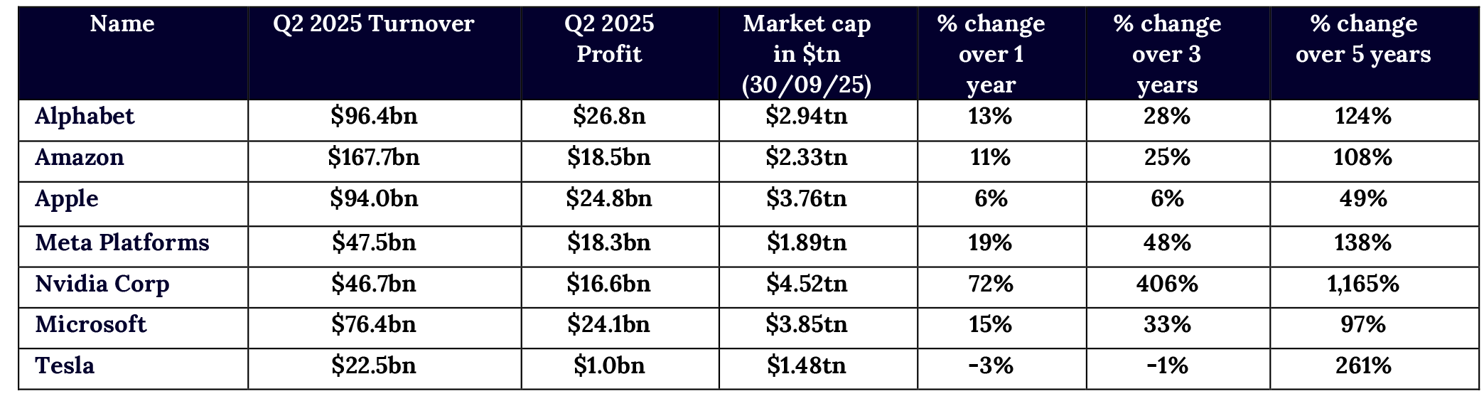 Amazon, Apple and Tesla lag well behind – flat in Amazon’s case and just a 1% gain for Apple.