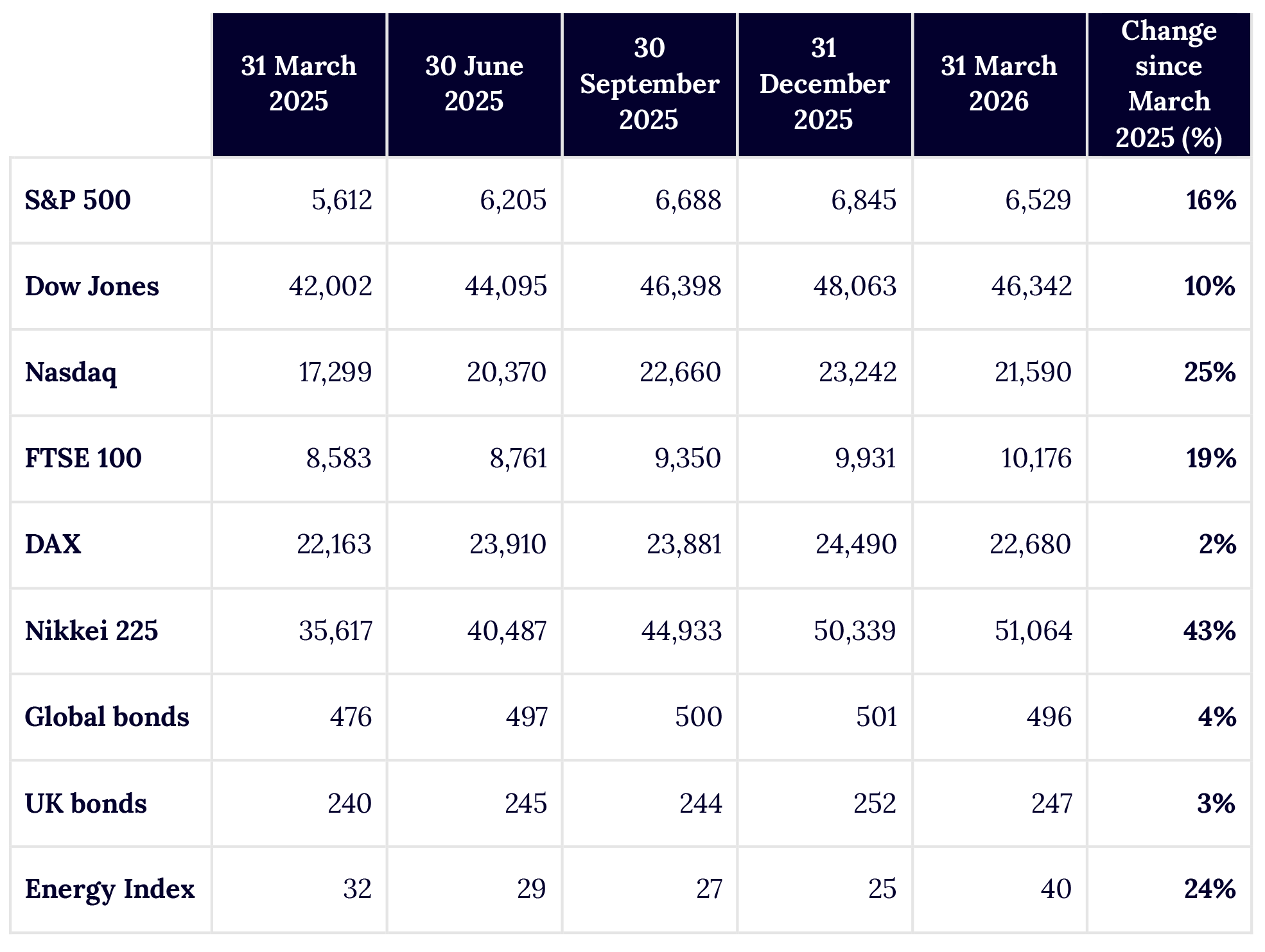 Gold’s bull run was finally interrupted in the first quarter as it reached a record high of $5,300 before retreating. It was still up 8% in the first quarter as a whole, however, and 60% over the past year. It is hard to see gold exceeding this peak, so for now upside may be limited. Gold has become riskier and more volatile over the past year or two but still has a role to play as a hedge in portfolios.
