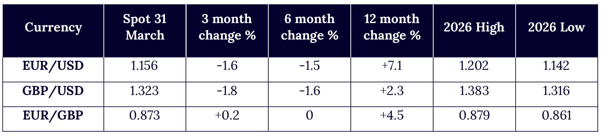 Euro/dollar edged down in the first quarter, making an attempt to break out of the 1.15-1.18 range it has mostly fluctuated in since last summer. It touched around 1.14 at the low, but then rebounded again. The dollar was boosted first by the nomination of Kevin Warsh as the new Fed chairman. It then strengthened again modestly after the outbreak of the Iran war, in keeping with the traditional “safe haven” pattern, but by less than in previous crises. Looking ahead, the outlook is ambiguous. While the war is likely to hit the European economy more than the US, the ECB looks more likely to raise rates than the Fed, indeed the Fed may cut rates. Pressure on the Fed to cut rates (or not hike) from the president could weaken the dollar if the inflation passthrough from the higher oil price is worse than expected.